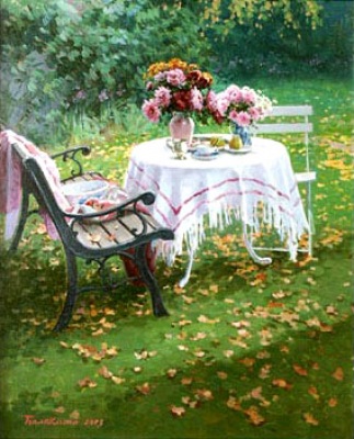 На зелёной лужайке в удобном кресле сидит красивая девушка. Она подобрала ноги «под себя» и прикрыла их мягким пледом. Закрыв глаза солнцезащитными очками, она настойчиво подставляет лицо осенним лучам нежного октябрьского солнца.